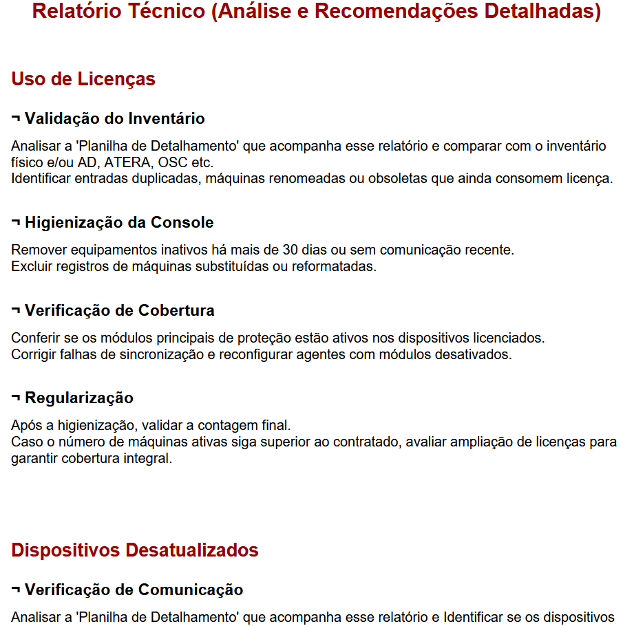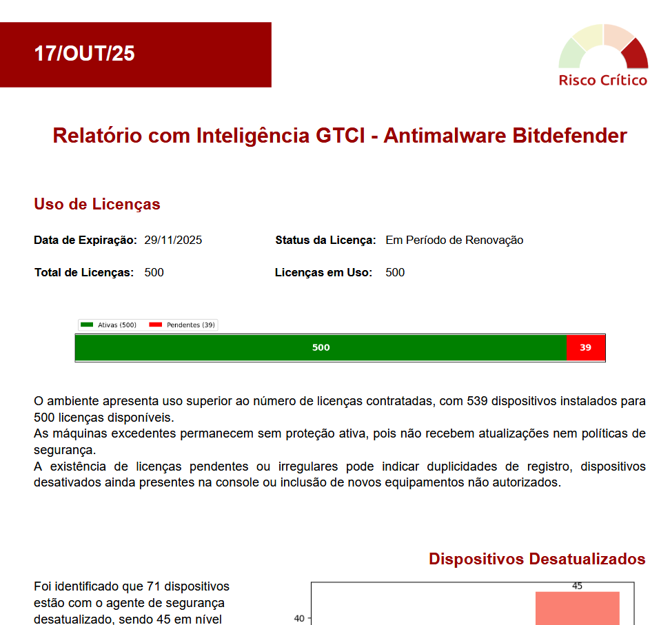 O Bitdefender é uma das plataformas mais avançadas de proteção corporativa, mas a eficácia depende da configuração, atualização e uso adequado dos módulos. O Relatório de Diagnóstico com Inteligência GTCI oferece uma visão consolidada do ambiente — destacando vulnerabilidades, licenciamento, conformidade e oportunidades de melhoria.
